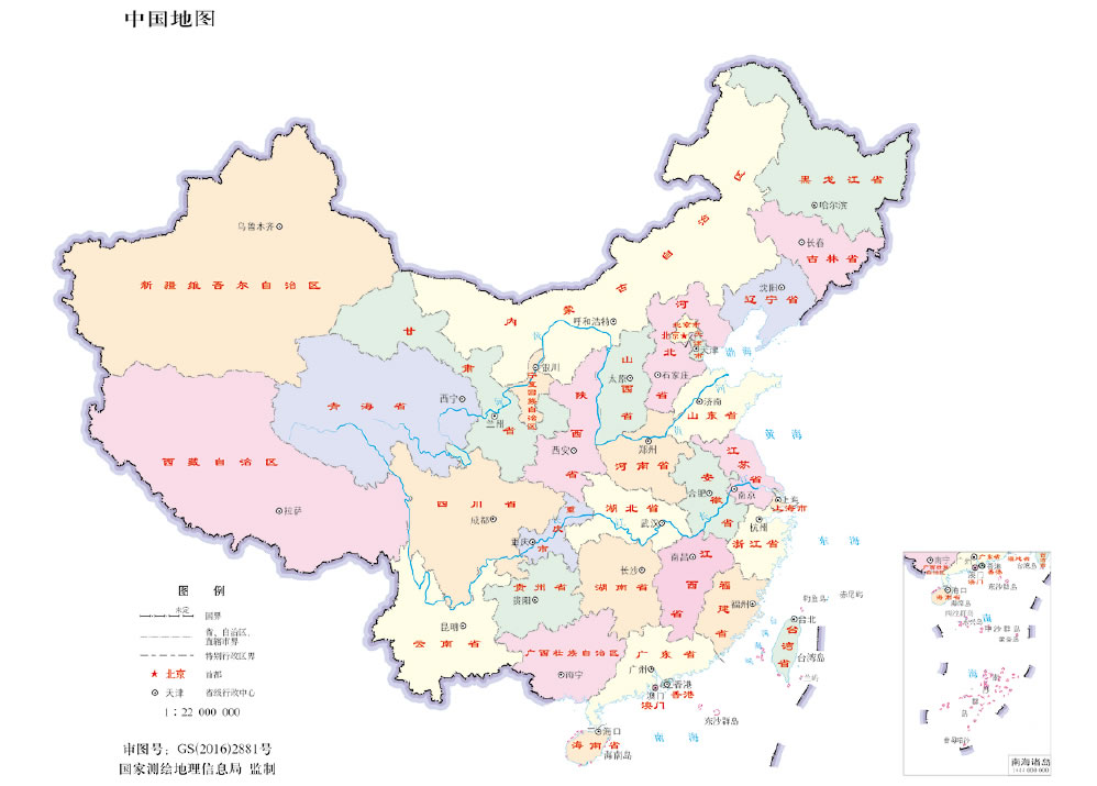 中國的地圖形象像是一隻公雞。中國有34個省級行政區。